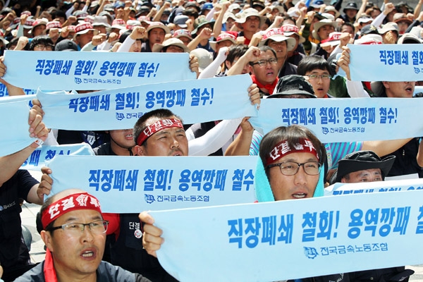 8일 금속노조(위원장 박상철)는 3천여명이 참여한 가운데 확대간부 파업 집회를 서울 신천동 한라그룹 본사와 경기 안산 SJM 공장 앞에서 잇따라 개최했다. 노조는 당초 이달 중·하순께로 예상됐던 3차 총파업 시기를 앞당겨 10일에 2시간 이상 부분파업을 벌이기로 했다. 17일에는 4차 총파업에 나선다. 박상철 위원장은 "4차 총파업 이후에도 사용자의 태도가 달라지지 않는다면 민주노총 각 산별연맹과 함께 중대한 결단을 내릴 것"이라고 경고했다. 박 위원장은 중대한 결단에 대한 구체적 언급은 피했지만 민주노총 총파업을 기점으로 전면적인 투쟁에 돌입하는 방안을 검토 중인 것으로 보인다.