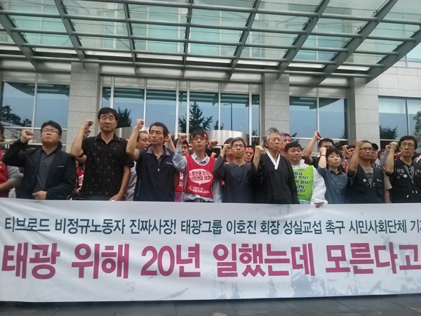 노동·사회단체가 참여하고 있는 ‘비정규직 없는 세상 만들기 네트워크’는 24일 오전 서울 광화문 티브로드 홀딩스 앞에서 기자회견을 열어 성실교섭을 촉구했다. 네트워크는 “티브로드지부의 파업 한 달이 되는 다음달 초까지 (티브로드 홀딩스의 모기업인) 태광그룹이 비정규직 문제를 해결하지 않을 경우 같은달 12일 대규모 희망지하철 행사를 벌일 것”이라고 밝혔다.