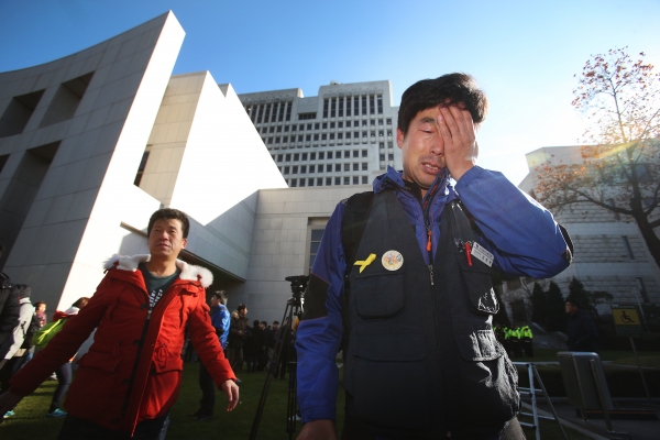 금속노조 쌍용차지부 대변인을 맡아 수없이 많은 기자들을 상대한 이창근 정책기획실장도 결국 카메라 앞에서 눈물을 보였다. 이 실장은 “오늘은 전태일 열사 44주기가 되는 날”이라며 “숨 쉴 곳 없는 이 사회에 한줄기 빛이 되는 판결이 나오기를 바랐는데, 결국 재판부는 전관예우와 친재벌의 속성을 버리지 않았다”고 비판했다. 회사측이 대법관 출신 변호인을 선임한 것이 재판 결과에 영향을 미쳤다는 주장이다.