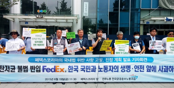 공공운수노조는 지난 19일 오전 서울 마포구 페덱스코리아 본사 앞에서 기자회견을 열고 "살인물질을 반입한 페덱스를 감염병의 예방 및 관리에 관한 법률(감염병예방법) 위반 등 국내법 위반 혐의로 고소·고발하겠다"고 밝혔다. 노조는 이달 초 페덱스코리아에 탄저균 배달과 관련한 진상규명과 재발방지책 마련을 요구하는 공문을 보냈다.