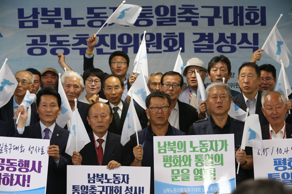 최종진 민주노총 위원장 직무대행도 "공동추진위 결성식이 남북에서 분산개최 방식으로 진행되긴 했지만 남북 노동자들의 의지를 꺾을 수는 없을 것"이라며 "남북노동자통일축구대회를 계기로 민족공동행사도 성사시키겠다"고 말했다.