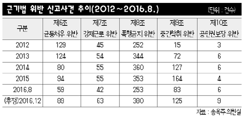 강제근로를 금지하는 근기법 위반 신고건수도 증가했다. 2012년 45건에서 지난해 55건으로 늘었다. 올해 8월 현재 42건으로 12월 말 63건을 기록할 것으로 예상된다.