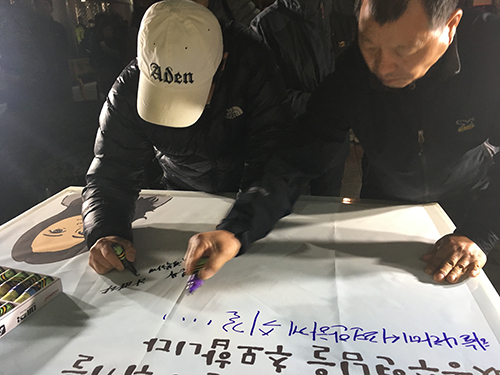 올해 1월 업무스트레스를 호소하며 목숨을 끊은 LG유플러스 콜센터 현장실습생 홍수연양의 아버지 홍순성씨. 막내딸이 환하게 웃는 얼굴이 그려진 추모메시지판에 검은색 마커펜을 꾹꾹 눌러 가며 추모의 글을 남겼다. 먹먹한 표정이었다.