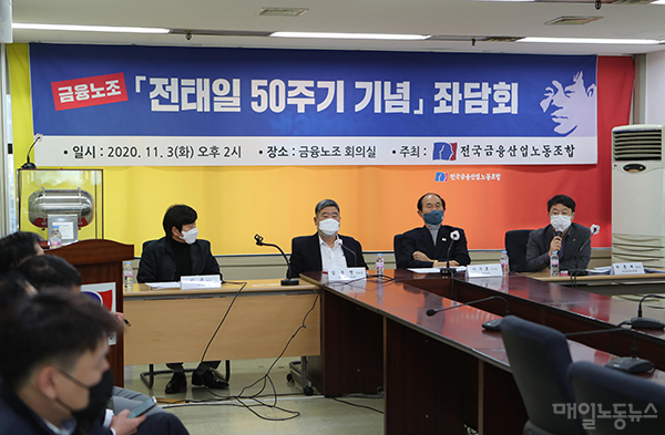금융노조(위원장 박홍배)가 전태일 50주기를 기념해 3일 오후 서울 중구 노조 회의실에서 좌담회를 개최했다. 이날 좌담회는 유튜브를 통해 생중계했다.