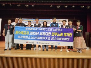 민주노총이 일본 원수폭금지 세계대회에 참석했다.민주노총은 일본 전국노동조합총연합(젠로렌) 초청을 받아 양경수 위원장과 최순영 금속노조 통일위원장, 변희영 공공운수노조 반전평화통일위원장 등 11명이 참석단을 꾸려 방일했다고 4일 밝혔다. 양 위원장은 6일 본대회에서 핵 보유국과 핵 의존국에서의 민중 투쟁을 주제로 연설한다.이 대회는 1945년 2차 대전 중 히로시마와 나가사키에 떨어진 핵폭탄으로 피폭된 피해자들이 비인도적 무기와 전쟁에 반대하는 목소리를 정기적으로 내 온 대회다. 일본뿐 아니라 세계적인 반전 시민대회로, 올해는 제레미
