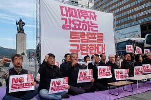 아시아태평양경제협력체(APEC) 정상회의를 앞두고 노동·시민사회가 대미협상 중단을 요구하며 농성에 들어갔다.민주노총과 시민사회단체연대회의 등으로 구성된 트럼프위협저지공동행동은 21일 오전 서울 광화문광장 이순신동상 앞에서 기자회견을 열고 “대미직접투자 3천500억달러를 포함한 6천억달러 미국 투자 요구는 한국에 제2의 IMF 이상의 파급력을 가진 중대한 사안”이라며 “80%가 넘는 국민이 트럼프 투자 강요, 관세협박이 부당하다고 여기고 있고, 이재명 정부에 부당한 압력에 맞서고 국민에게 올 피해를 최소화하라고 요구하고 있다”고 강조