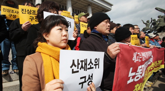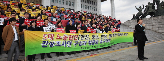 이상한 일이다. 5대 노동현안이라 했는데 거기 현수막엔 한진중·쌍용차·현대차·전북버스 네 곳만 적혀 있다. 한 곳이 빠졌다. 백혈병 얻어 쓰러지고, 업무스트레스 끝에 투신하는 노동자가 줄을 잇는 그 공장. 산재 인정도, 사과도 없어 유가족들 여럿이 다만 거리에서 오래 떠돌아 분에 외친 그 이름 말이다. 노동조합 그 이름 끝내 금기로 남아 유가족 기대어 싸울 곳도 그곳엔 없었다. 노동3권이 거기에 없던 탓일까, '노동' 현안에 그 이름 보이지 않았다. 그러고 보니 이상하지도 않은 일. '삼성불가침'이라고도 하지 않던가. 삼성전자에서 일하다 백혈병으로 지난 2005년 사망한 고 황민웅씨의 부인 정애정씨가 10일 국회 본관 앞 계단에 섰다. 삼성전자 백혈병 문제를 포함한 5대 노동현안의 진상규명과 청문회 실시를 촉구했다.