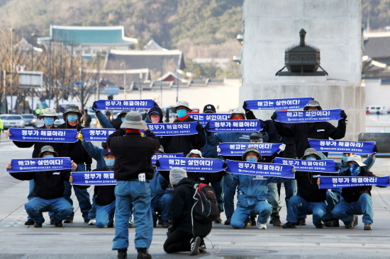 정리해고 철회를 주장하며 상경투쟁을 벌이고 있는 한진중공업 노동자들이 22일 오후 서울 광화문광장 이순신 장군 동상 앞에 모여 '인증샷'을 남기고 있다. 광화문 인근 주요 명소를 두루 담았다. 바짝 따라붙은 경찰의 연행 경고는 한 귀로 흘리고 사진찍기에 열중했다. '해고는 살인이다', '정부가 해결하라'고 쓰인 펼침막을 부지런히 펴고 접었다. 오래 머물지도 않았다. 머물 수도 없었다. 한진중공업·쌍용자동차·대우자동차판매·발레오공조코리아 등 금속노조 정리해고 철회 공동투쟁단 소속 노동자들이 이날 서울 곳곳을 떠돌며 갖은 방법으로 처지를 알렸다. '인증샷'을 남겼다.