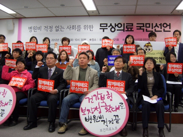 김영훈 민주노총 위원장은 “양대 노총을 비롯한 시민·사회단체들이 총·대선을 통해 반드시 무상의료를 실현하겠다”고 다짐했다. 이정식 한국노총 사무처장은 “모든 국민은 건강하게 살다가 죽을 권리가 있다”며 “무상의료 정책을 민주통합당에서 적극적으로 관철해 나가겠다”고 말했다.