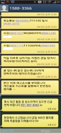 이때 사용된 발신자 번호(1588-3366)는 삼성전자서비스의 대표번호다. 문자메시지의 내용은 AS서비스 수임 약속 등 업무관련 통보와 수리비 환불 처리요령, 민원접수 급증에 따른 업무시간 연장통보 등이다. AS 기사들의 업무와 직결되는 사안이다.