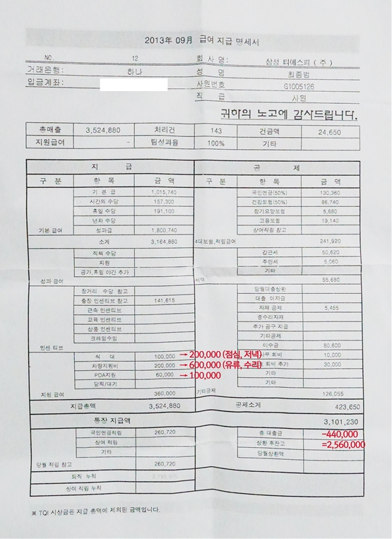 이에 대해 이제근 천안센터 사장은 “숨진 최씨는 최근 3개월간 500만원 이상의 월급을 받았다”고 주장했다. 그런데 이는 사실과 다르다. 삼성전자서비스지회 천안분회가 공개한 고인의 9월 급여명세서<사진>를 보면 최씨는 이달 5일 총 352만4천880원의 매출을 올렸다. 각종 사회보험 등을 공제하고 실제 수령한 돈은 310만원이 조금 넘었다. 이마저도 최씨가 남들과 달리 야근과 휴일근무를 자처한 결과다. 다른 직원들이 오후 6시에 퇴근할 때 최씨는 늦은 밤까지 일하는 경우가 잦았다는 것이 동료들의 전언이다.