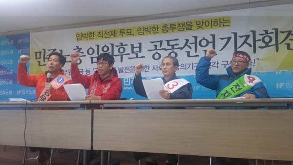 위원장 후보들은 2일 오후 서울 정동 민주노총 회의실에서 합동 기자회견을 갖고 “공무원연금 개악은 정부가 자본의 사적연금 장사를 도와주기 위해 노동자들의 노후불안을 가중시키는 첫 포석”이라며 “공무원을 시작으로 모든 노동자의 노후안정망을 파괴하는 시발점이 될 공적연금 개악은 반드시 중단돼야 한다”고 주장했다.