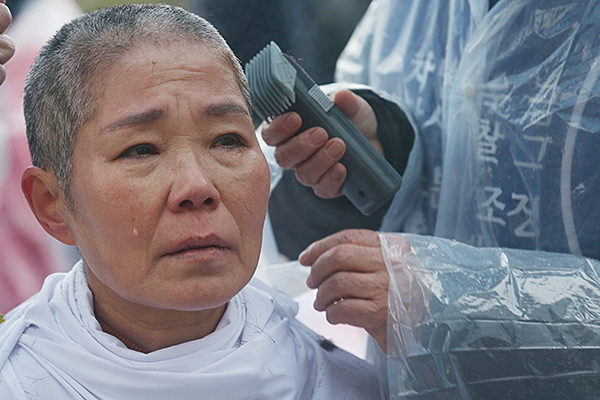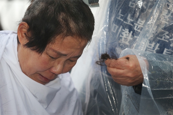 숭실대 청소노동자 장보아씨 등 2명과 김형수 서울일반노조 위원장이 16일 오후 서울 동작구 숭실대 본관 앞에서 삭발했다. 노조 숭실대분회는 "숭실대 청소와 시설관리를 위탁받은 미환개발이 각종 수당을 체불하고 노조를 탄압했으며 용역비를 착복한 만큼 퇴출시켜야 한다"고 요구하며 농성을 벌여 왔다.