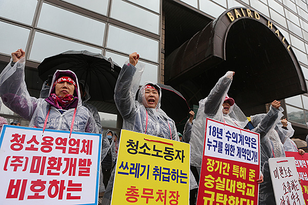 숭실대가 노조 탄압과 용역비 착복 의혹이 불거진 업체와 재계약할 방침인 것으로 전해져지면서 숭실대 청소노동자들이 삭발항의에 나섰다.