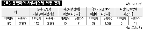 해당 업체들은 일시·간헐적 사유 없이 파견노동자를 상시사용(142곳·2천268명)했거나 형식적 도급계약을 맺고 무허가 파견을 사용(38곳·1천29명)했다. 5곳은 적법파견이었지만 최대 사용기간 2년을 넘긴 것으로 나타났다.<표 참조>
