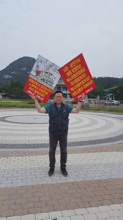 21일 택시업계에 따르면 전택노련(위원장 강신표)과 민택노조(위원장 구수영)는 이달 14일부터 청와대와 정부서울청사·세종청사, 국회 앞에서 여객자동차법 시행령 개정안 폐기를 요구하며 게릴라 1인 시위를 벌이고 있다.