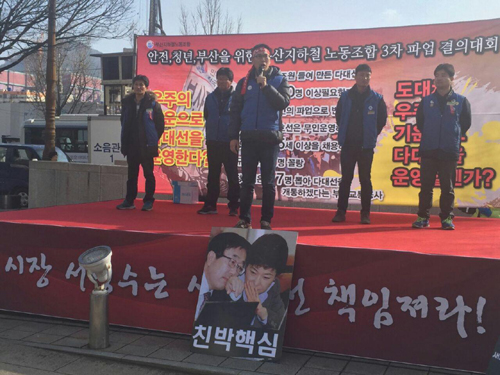 ▲ The Busan Subway Labor Union(BSLU) stages an open ended walkout from December 20, due to the conflicts over the staff recruitment for the new subway line in Busan.(courtesy of BSLU)
