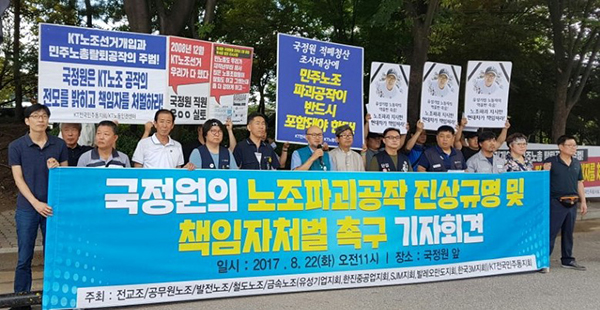 전교조·공무원노조·발전노조·철도노조·금속노조·KT전국민주동지회는 22일 오전 서울 내곡동 국정원 앞에서 기자회견을 열고 “대통령은 노동존중 사회를 위해 노조가입률 제고와 부당노동행위 척결을 언급했지만 아이러니하게도 국정원 노조파괴 공작이 적폐청산 조사대상에서 빠져 있다”며 “노조할 권리와 노조파괴 공작은 양립할 수 없다”고 비판했다. 이들은 국정원의 노조파괴 불법행위에 대한 진상조사와 책임자 처벌을 촉구했다.
