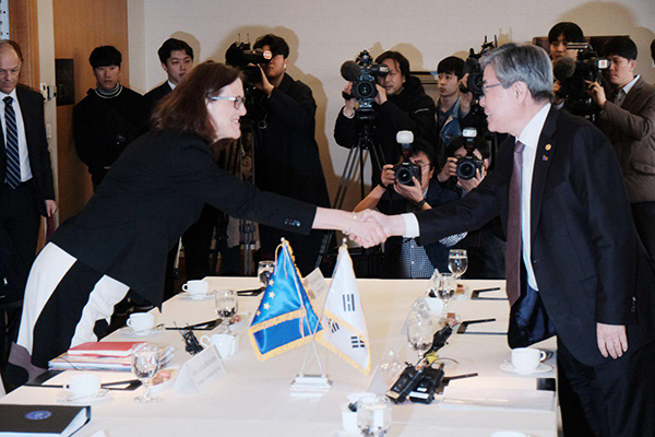 ▲ 이재갑 노동부 장관과 세실리아 말름스트룀 EU 집행위원회 통상담당 집행위원이 지난 9일 오전 서울 중구 롯데호텔에서 한국의 ILO 핵심협약 비준에 대해 의견을 나눴다. <정기훈 기자>