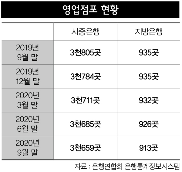30일 은행연합회 은행통계정보시스템의 국내 은행 영업점포 현황을 분석한 결과 9월 말 기준 시중은행 점포는 3천659곳, 지방은행 점포는 913곳이었다. 점포는 분기마다 줄었다. 지난해 9월 말 시중은행 점포는 3천805곳, 지방은행 점포는 935곳이었으나 지난해 말 시중은행은 3천784곳으로 줄었다. 지방은행은 935곳으로 같았으나, 올해 들어 계속 감소했다.