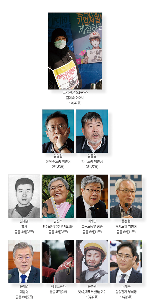 전태일 열사(23표)와 김진숙 민주노총 부산본부 지도위원(23표)이 공동 4위에 올랐다.