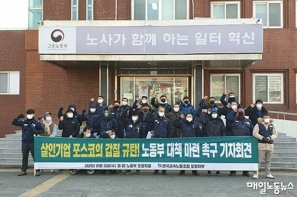 한편 이날 오전 금속노조 포항지부와 포스코사내하청지회는 포항지청 앞에서 기자회견을 열고 노동부에 △노동자 참여를 보장한 안전보건진단 실시 △불시 현장점검 정례화 △산재은폐를 방지할 수 있는 시스템 마련을 요구했다. 지부 관계자는 “23일 사망사고로 감독기간이 연장되는 과정에서 지회의 감독 참여가 배제되는 문제가 발생했다”며 “일회적 감독이 아닌 반복되는 중대재해를 막을 수 있는 시스템 개선이 필요하다”고 지적했다.