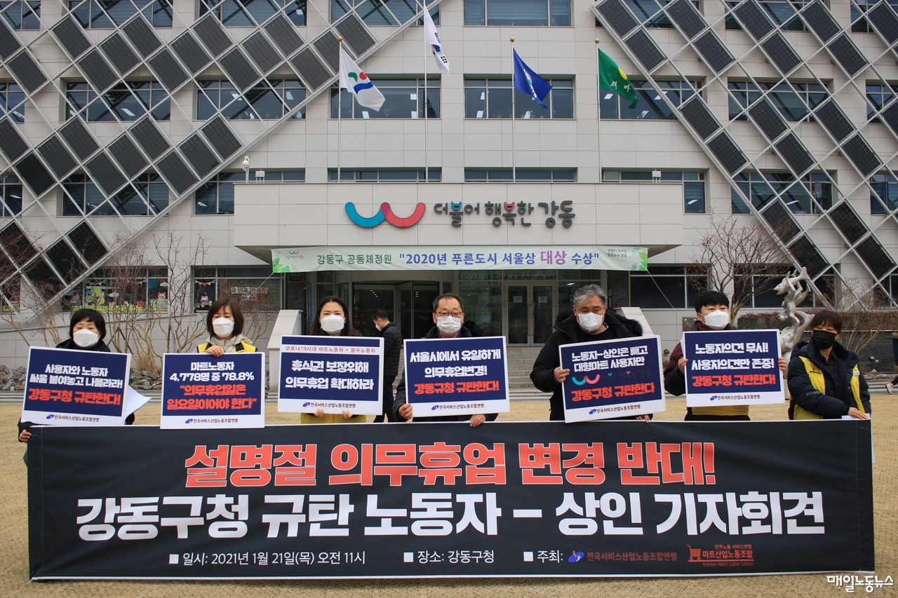 서비스연맹·마트산업노조·전국중소유통상인협회·한국중소상인자영업자총연합회는 21일 오전 서울 강동구청 앞에서 기자회견을 열고 “강동구가 노동자와 지역 상인 의사를 무시하고 8년째 대형마트 의무휴업일을 변경하고 있다”고 비판했다. 노조는 최근 명절을 앞두고 일부 지방자치단체에 의무휴업일 변경 여부를 문의했다. 노조 관계자에 따르면 서울시에서 유일하게 강동구만 올해 의무휴업일 변경을 추진한다고 답했다. 강동구는 유통산업발전법이 제정된 2012년부터 매년 설과 추석에 의무휴업일을 변경해 왔다.