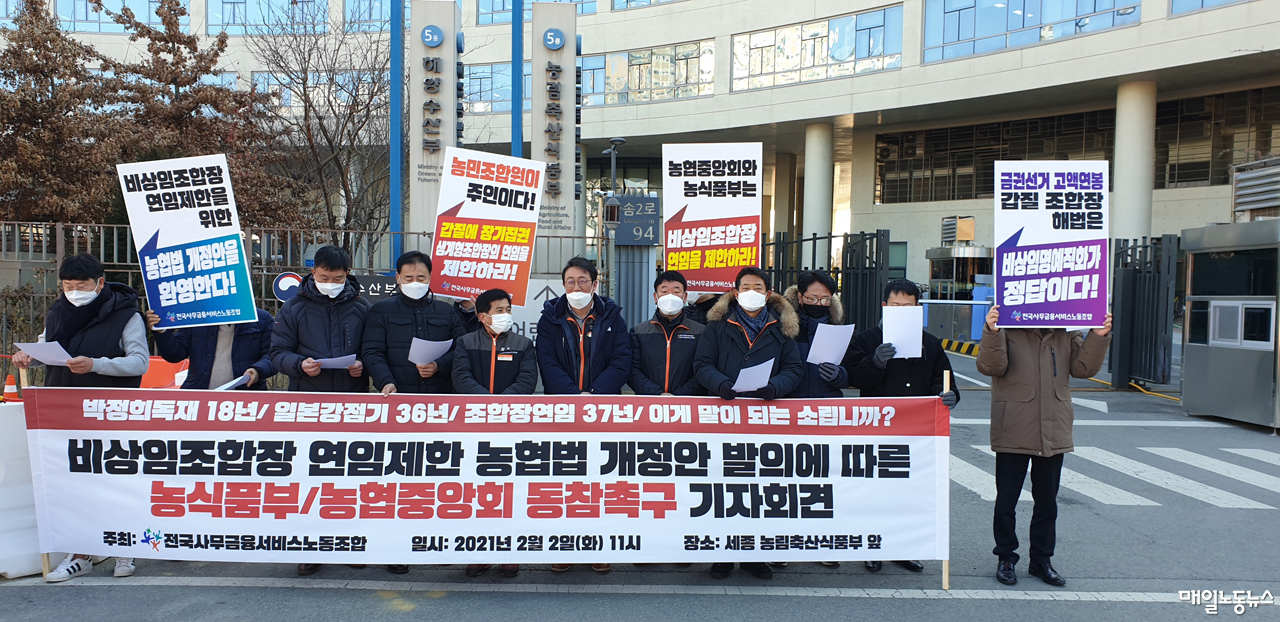 사무금융노조는 2일 오전 세종시 농림축산식품부 앞에서 기자회견을 열고 비상임조합장 연임을 상임조합장과 같이 2회로 제한하고, 공직선거 출마시 선거일 60일 전까지 사퇴하도록 해야 한다고 주장했다.