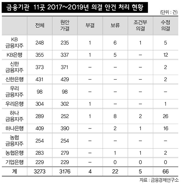 보고서를 보면 금융기관 11곳은 이사회를 연 14.5회 열고, 위원회를 연 6.9회 열었다. 이 기간 동안 이사회에 발의된 안건은 3천273건이다. 이 중 3천176건(97%)이 원안대로 가결됐다. 부결된 안건은 단 4건이다. 보류도 5건에 그쳤다. 조건부 의결 5건, 수정 의결 26건이다. 사실상 없는 것이나 마찬가지 수준이다. 이사회와 각종 위원회가 회장이나 은행장 뜻대로 움직였다는 풀이가 가능하다.