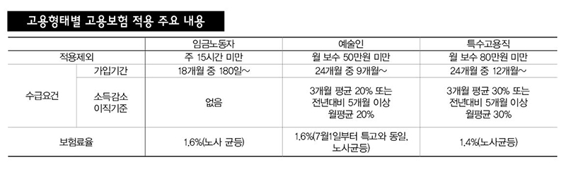 예술인의 경우 적용제외 소득 기준이 월 50만원으로 특수고용직보다 30만원이 적다. 고용노동부 관계자는 “임금노동자도 주 15시간 이하로 일하면 적용을 제외하는데 이들의 월 평균 소득이 80만원 수준”이라며 “월 80만원을 받지 못하면 일종의 ‘부업’으로 고용보험을 통한 보호가 필요한 일자리로 보기 어렵다”고 이유를 설명했다. 다만 월 80만원에 미치지 못한 일자리가 여러 개일 경우 내년부터는 합산해서 가입 여부를 판단한다. 국세청 특수고용직 소득파악 시스템을 구축하는 데 시간이 필요해서다.