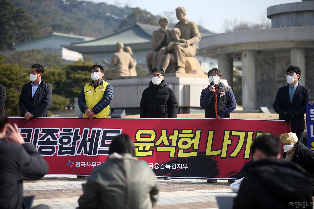 금융감독원노조(위원장 오창화)는 3일 오전 청와대 분수대 앞에서 기자회견을 열고 “인사참사를 책임지는 방법은 사퇴뿐”이라며 이같이 밝혔다. 노조는 “5일까지 거취를 밝히라”고 경고했다.