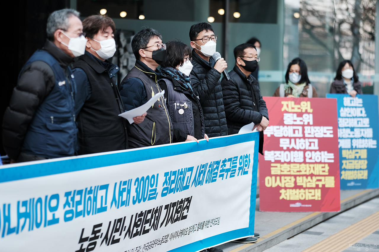 김 지부장은 10일 오전 노조와 비정규직 이제그만 공동투쟁을 포함한 시민사회단체가 서울시 중구 서울지방고용노동청 앞에서 연 아시아나케이오 정리해고 사태 해결 촉구 기자회견에서 원직 복직을 요구했다.