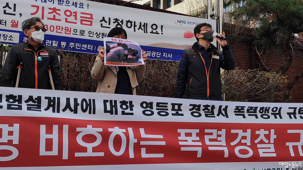 지회는 경찰이 노조의 정당한 집회와 시위·행진을 방해하면서 계속해서 부상이 발생한다고 주장했다. 이달 3일 63빌딩 앞 천막을 설치할 때도 경찰과 충돌해 노조 관계자 1명이 인대가 파열기도 했다고 전했다. 오세중 보험설계사지부장은 “방역수칙을 위반했으면 채증해서 법 집행을 하면 될 일인데 굳이 물리적으로 막아서는 이유가 뭐냐”며 “과도한 경찰력 행사로 부상자가 속출하고 감염병 전파 우려도 커지는 것 아니겠느냐”고 비판했다.
