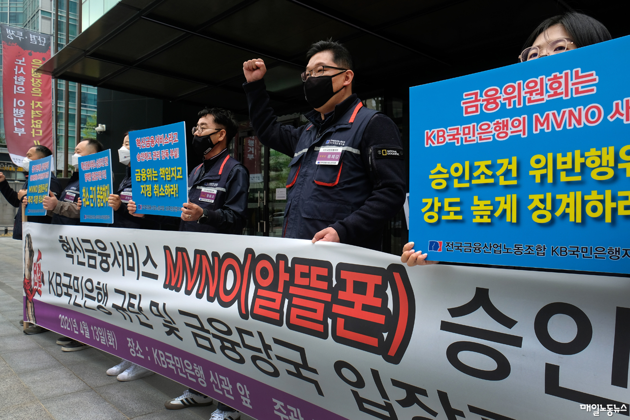금융노조 KB국민은행지부(위원장 류제강)는 13일 오전 서울 영등포구 KB국민은행 신관 앞에서 기자회견을 열고 “은행은 알뜰폰 사업이 혁신금융서비스로 지정된 뒤 승인부가조건을 어기고 갖가지 실적경쟁을 조장했다”며 “금융당국이 혁신금융서비스 승인부가조건 위반 책임을 물어 알뜰폰 사업 지정을 취소해야 한다”고 강조했다.