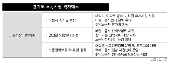 경기도가 코로나19 이후 더욱 심화하는 양극화 해소를 위해 경제·지역·노동 등 분야별 격차해소를 위한 7대 전략을 수립했다. 노동시장 격차해소를 위해 노동자 휴식권 보장·안전한 노동일터 조성·노동권익 보호에 힘쓴다.