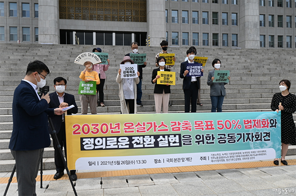노동·환경단체와 진보정당이 26일 오후 국회 본관 앞 계단에서 기자회견을 열고 2030년 온실가스 감축 목표 50% 법제화와 정의로운 전환 실현을 촉구했다.