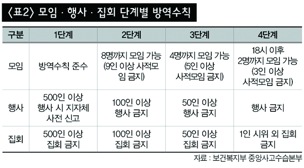 새 지침에서는 그동안 5단계로 운영해 온 사회적 거리 두기를 4단계로 조정한다. 1단계는 하루 발생 확진자수 전국 기준 500명 미만·수도권 250명 미만, 2단계는 전국 500명 이상·수도권 250명 이상, 3단계는 전국 1천명 이상·수도권 500명 이상, 4단계는 전국 2천명 이상·수도권 1천명 이상일 때다.<표1 참조>