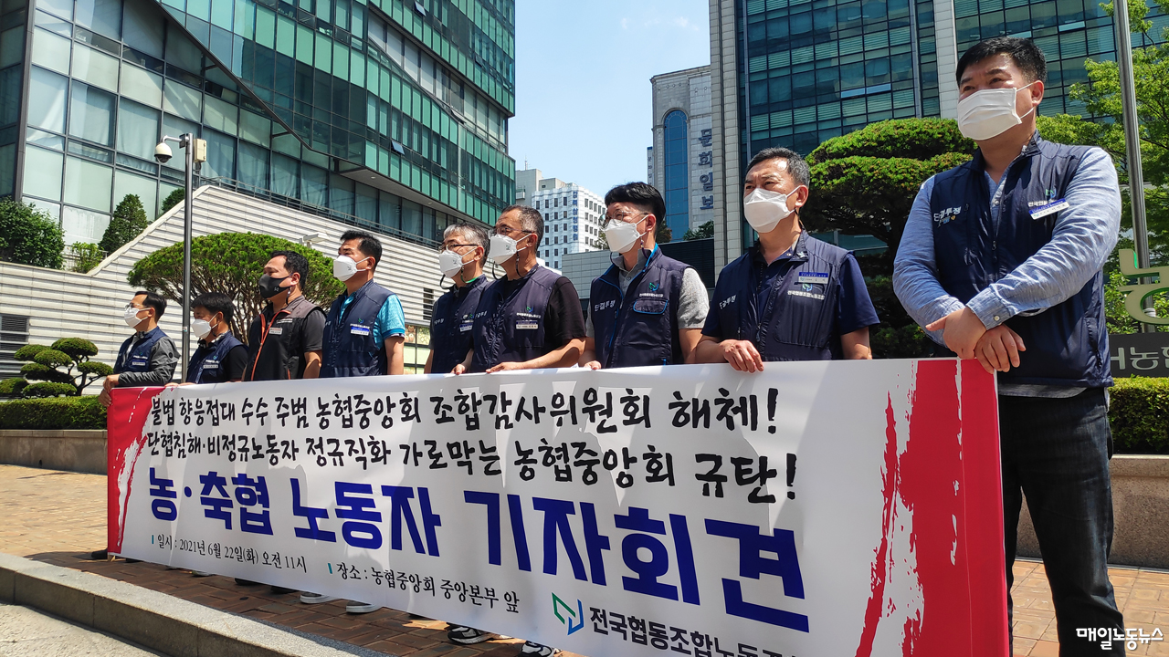 협동조합노조(위원장 민경신)는 22일 오전 서울 중구 농협중앙회 앞에서 기자회견을 열고 “노사 갈등이 극심한 한림농협을 감사하러 내려간 감사위 감사반원이 현지 조합장에게 접대를 받았다”며 “감사위가 피감기관에서 향응 접대를 받은 것은 심각한 도덕적 해이일 뿐만 아니라 감염병예방수칙 위반”이라고 지적했다.