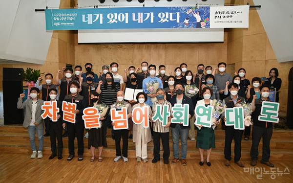 창립 2주년을 맞은 사무금융우분투재단(이사장 신필균)이 23일 오후 서울 마포구 청년문화공간JU동교동에서 기념식을 개최했다. 이날 함께 열린 우분투상 시상식에서는 아파트 경비노동자 정의헌(67)씨가 우분투상을 받았다.
