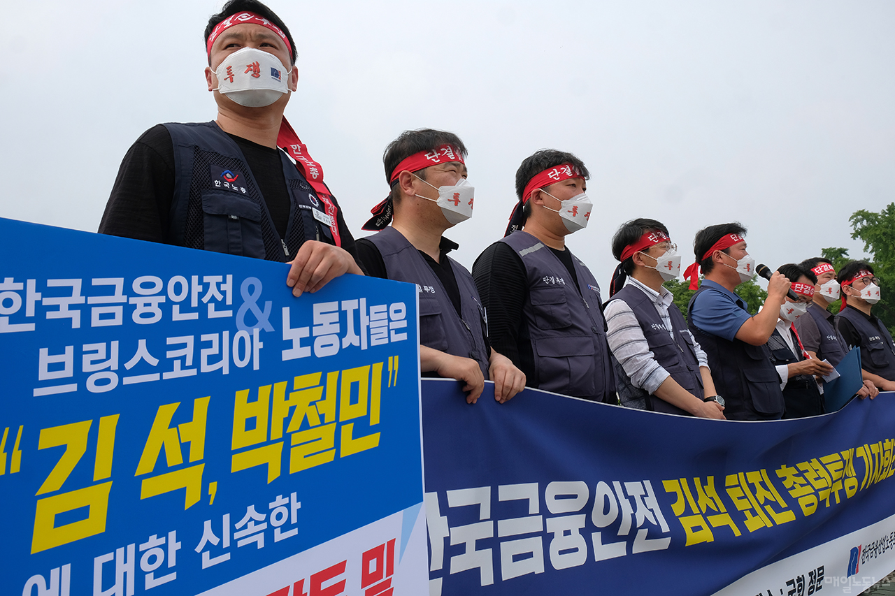 이날 노동자들은 김석 한국금융안전 대표가 최근 KB국민은행과의 물류 업무계약에 무리한 수수료를 요구해 사업권을 사실상 자진반납했다고 주장했다. 박홍배 위원장은 “최근 국민은행 물류 업무계약 입찰 과정에서 한국금융안전은 장당 2.5원을 제시해야 계약 성사 가능성이 있다는 사내 분석에도 2.8원을 제시해 2.55원을 써 낸 경쟁업체로 계약을 넘겼다”며 “회사 매출의 가장 큰 비중을 차지하던 NH농협과의 물류 업무계약도 사실상 자진 반납했다”고 비판했다.
