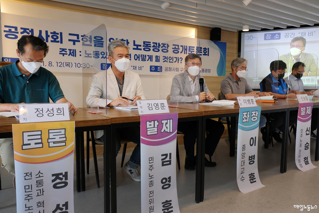 양대 노총 전·현직 간부들이 합류한 노동광장은 12일 오전 서울 중구 공간채비에서 ‘노동 있는 대선 어떻게 할 것인가’ 주제의 공개토론회를 통해 출범을 공식화했다. 노동광장은 당초 지난달 11일 출범식을 예정했으나 코로나19 확산으로 연기한 바 있다. 이용득 전 한국노총 위원장이 상임대표, 신승철·김영훈 전 민주노총 위원장이 공동대표를 맡았다.