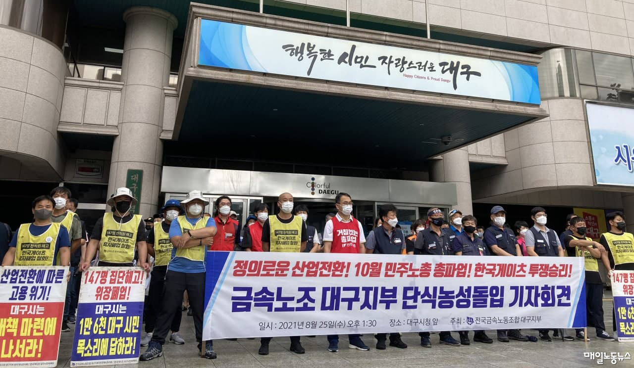 자동차 부품 제조업이 몰려 있는 터라 대구지역 제조업 노동자가 느끼는 위기감은 크다. 지난해 7월 미국 게이츠와 일본 니타가 지분을 소유한 합자회사 한국게이츠는 코로나19를 이유로 돌연 폐업해 147명이 일자리를 잃었다. 한국게이츠 해고노동자 19명은 대구시청 앞 천막을 치고 105일째 노숙농성 중이다.