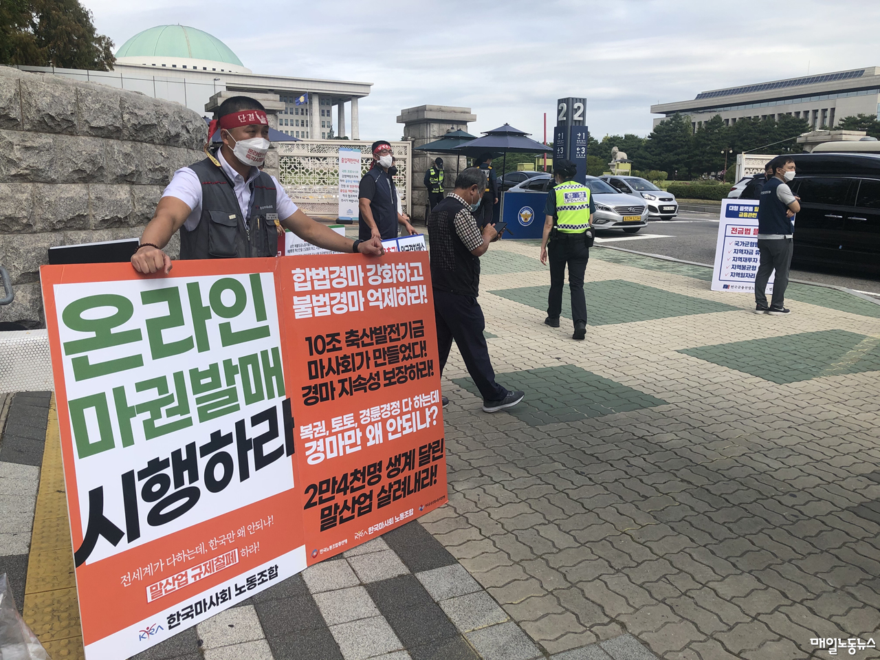 이런 상황이 이어지면서 마사회노조(위원장 홍기복)는 51일째 1인 시위를 하고 있다. 7월7일 청와대 분수대 앞에서 1인 시위를 시작한 노조는 정부세종청사에 이어 28일부터 국회 앞 1인 시위에 돌입했다. 홍기복 위원장은 “유사한 경륜·경정은 이미 온라인 발매를 도입해 시행하고 있고 사회적 불신을 해소하기 위한 혁신방안까지 마련한 상황에서 고사 직전까지 몰린 말 산업과 마사회의 현실을 고려하면 온라인 마권 도입이 절실하다”며 “주무부처는 ‘국민적 공감대’ 같은 추상적인 표현을 거두고 온라인 마권 발매를 도입하는 데 협력해야 한다”고 말했다.