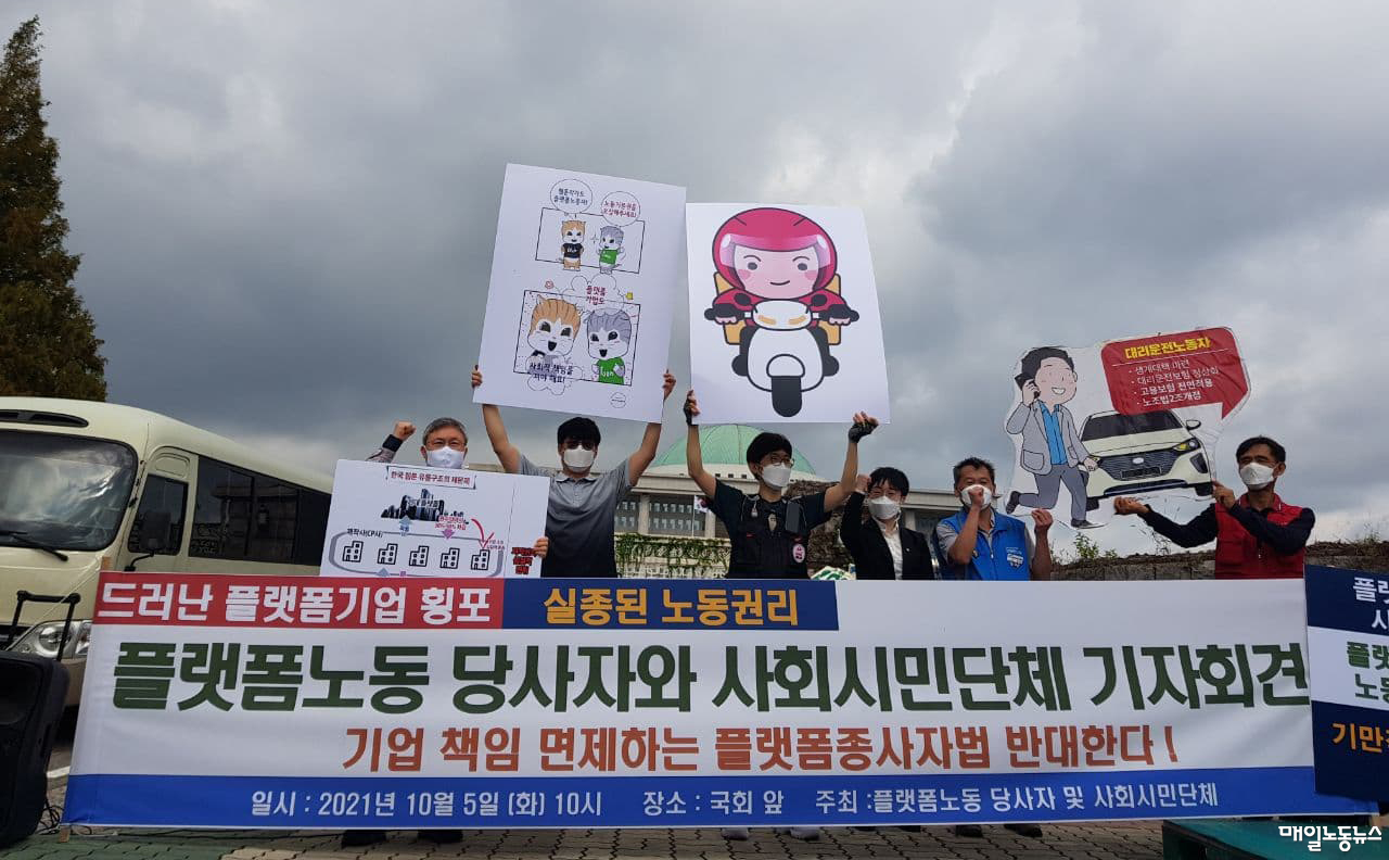 라이더유니온·대리운전노조·웹툰노조·공공운수노조 택시지부·참여연대·민변 노동위원회·한국비정규노동센터는 5일 오전 국회 앞에서 기자회견을 열고 “플랫폼기업들의 독점적 횡포 심각성이 사회문제가 되고 있지만 플랫폼노동 당사자 목소리는 배제돼 있다”고 주장했다.