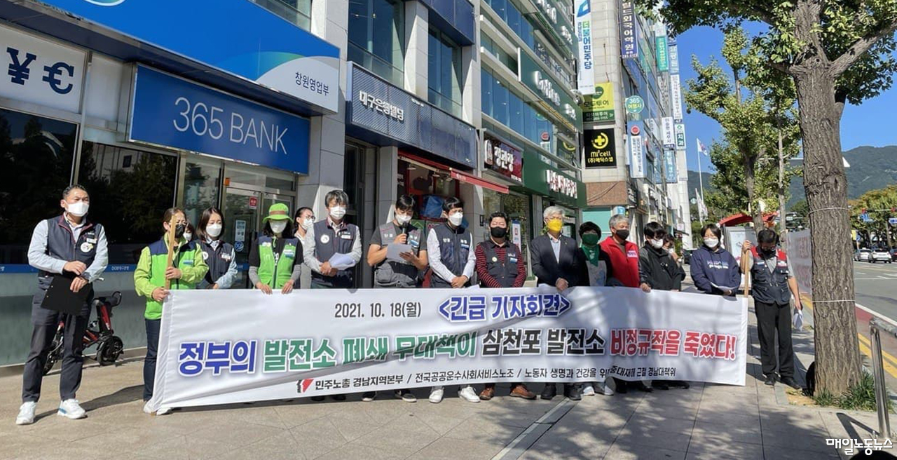 노조는 이날 오후 경남 창원 더불어민주당 경남도당 앞에서 기자회견을 열고 “문재인 정부와 더불어민주당이 정규직 전환 약속만 지켰어도 고인의 죽음을 막을 수 있었다”고 주장했다. 홍종한 노조 경남본부장은 “고 김용균씨가 사망한 뒤 정부는 발전소 비정규 노동자를 정규직으로 전환하겠다고 약속했지만 지키지 않았다”며 “석탄화력발전소를 폐쇄하면서 노동자들의 고용을 보장하기 위한 대책은 내놓지 않고 있다”고 강조했다.