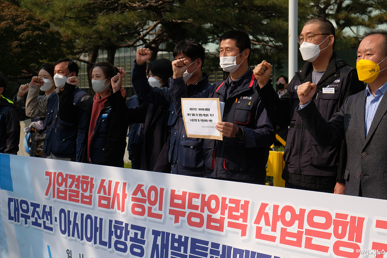 양동규 민주노총 부위원장은 “산업은행은 독과점 문제가 발목을 잡을 것이라는 사실을 파악하지 않은 채 밀실 매각을 밀어붙였다”며 “대우조선과 아시아나항공 매각을 중단하고 노동계와 대화에 나서야 한다”고 촉구했다. 양 부위원장은 기자회견 직후 산업은행 관계자에게 항의서한을 전달했다.
