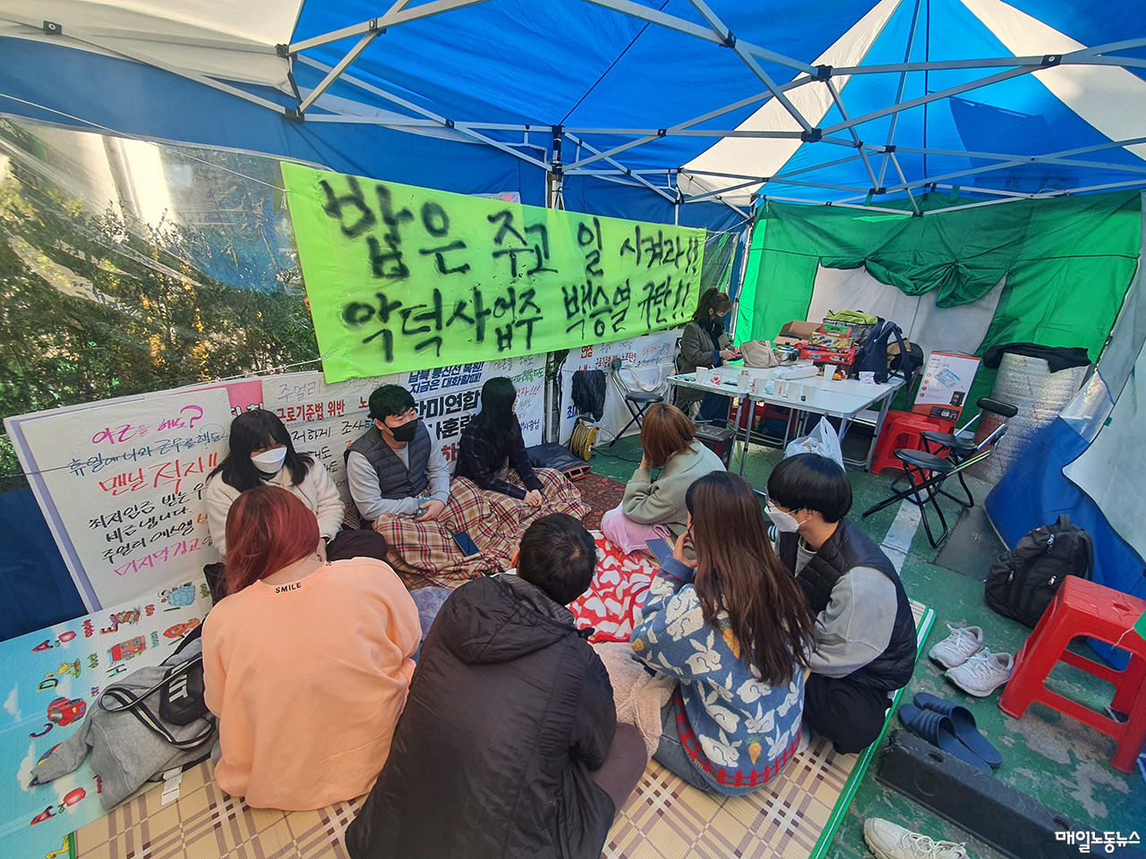 김씨를 포함한 13명의 노동자는 매일 공장 앞 천막농성장으로 출근한다. 그는 “노조가 없었으면 임금 삭감을 당하고도 억울함을 모르고 살았을 것”이라며 “그나마 이런 억울함, 문제의식이 생기는 것이 다행”이라고 말했다. 이어 “이미 폐업을 선언한 상태에서 ‘폐업을 해도 괜찮다’는 각오로 싸우려 한다”고 다짐을 전했다.