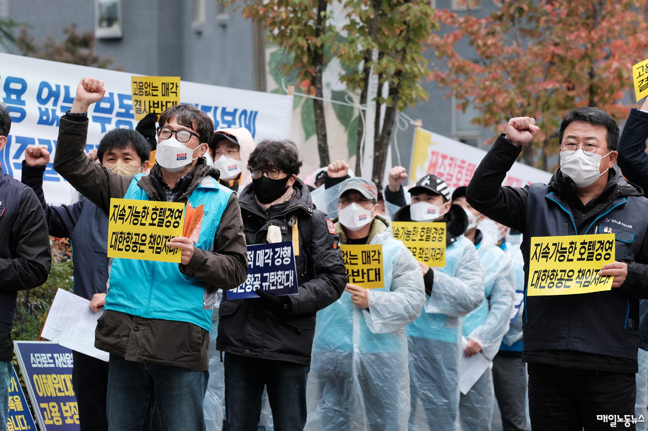 제주칼호텔 식음료부서에서 16년차 웨이터로 일한 김동현(39)씨는 9일 오전 7시 제주도에서 서울행 비행기에 올랐다. 지난해 결혼을 하고 한 아이의 아빠가 된 김씨는 갑작스러운 매각 소식에 생계가 막막해졌다. 그는 이날 서울 중구 대한항공 빌딩 앞에서 30여명의 동료들과 함께 “고용보장 없는 매각을 중단하라”고 외쳤다.