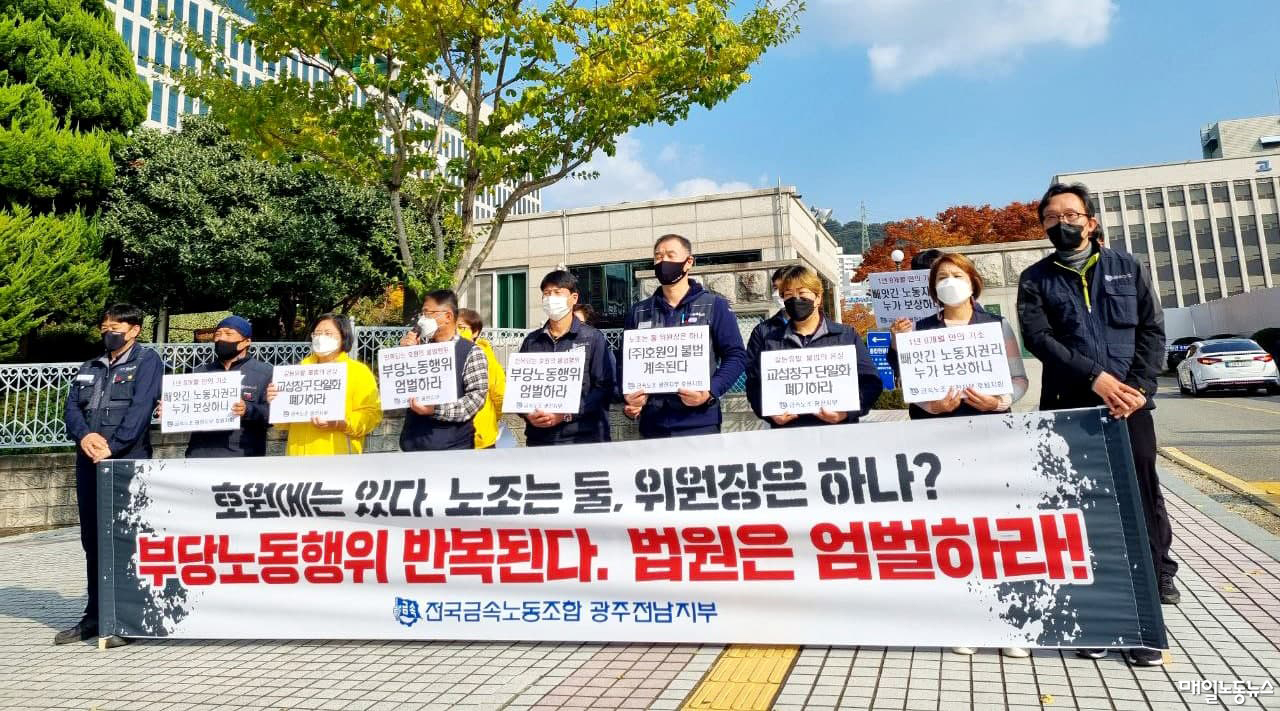 행정소송 판결이 호원 임직원들에 대한 형사재판에 영향을 미칠지도 관심사다. 호원 대표와 임직원 등 6명은 금속노조 호원지회의 교섭대표노조 지위를 빼앗고 기업노조 설립에 공모·개입한 혐의로 기소돼 다음달 15일 광주지법에서 첫 재판을 앞두고 있다. 지회는 지난 1일 광주지법 앞에서 기자회견을 열고 “(회사 임직원들을) 고소한 지 1년9개월 만에 기소됐다. 호원에 대한 수사 장기화는 이례적”이라며 엄벌을 촉구했다. 호원 관계자는 “담당자가 자리를 비웠다”며 즉답을 피했다.