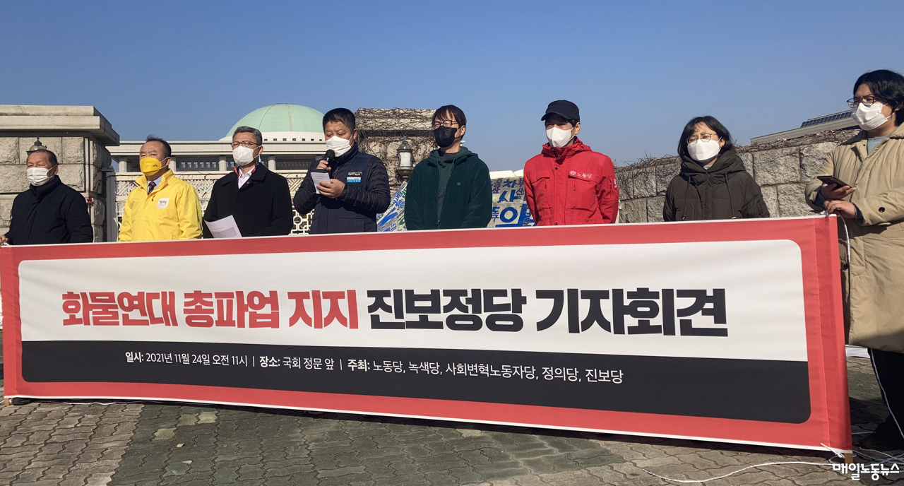 노동당·녹색당·사회변혁노동자당·정의당·진보당은 24일 오전 국회 앞에서 ‘화물연대본부 파업지지 기자회견’을 열었다. 김응호 정의당 부대표는 “화물연대본부는 정부에 안전운임제 개선을 요구하며 대화를 요청했지만 응답이 없었다”며 “국민의 생명과 노동자의 안전이 달려 있는 사안이기 때문에 정부는 수수방관할 게 아니라 적극적으로 대안을 제시하고 대화에 나서야 한다”고 말했다.